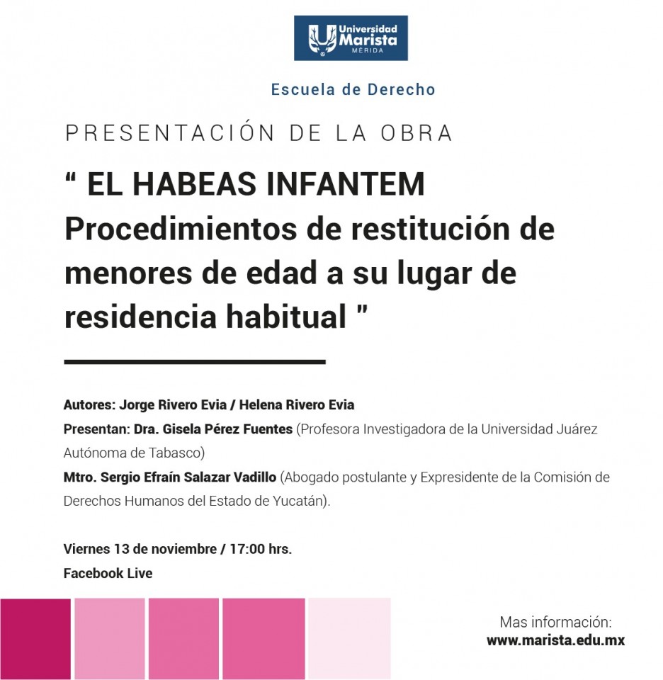 La Escuela de Derecho invita a la presentación de la obra: " EL HABEAS INFANTEM Procedimientos de restitución de menores de edad a su lugar de residencia habitual"