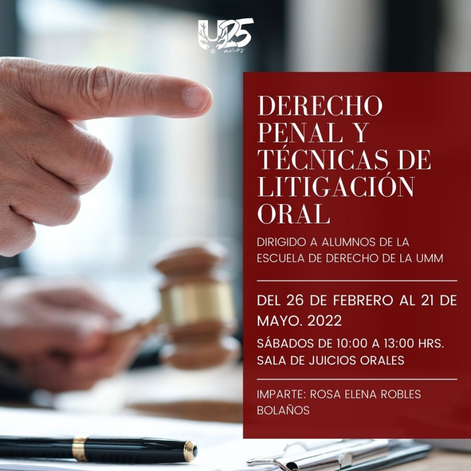 La Escuela de Derecho invita a todos sus alumnos interesados al curso de Derecho Penal y Técnicas de Litigación Oral, impartido todos los sábados a partir del 26 de febrero al 21 de mayo.