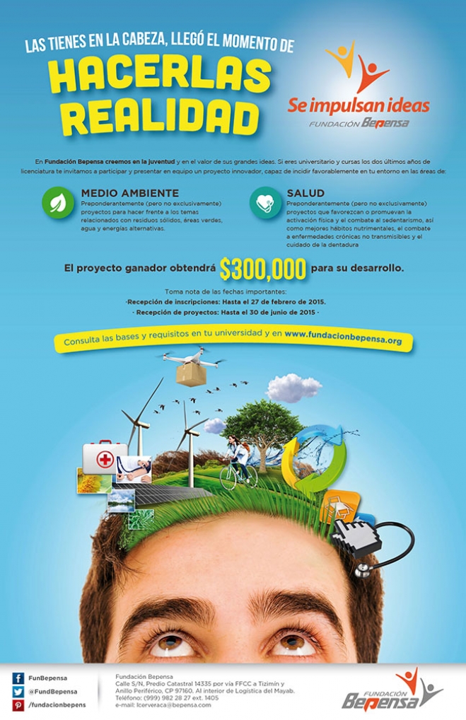 FUNDACIÓN BEPENSA, A.C. invita a alumnos universitariosa participar en la Convocatoria “Se impulsan Ideas” 2015, cuyo objetivo es promover el fortalecimiento de los estudiantes de cualquier licenciatura de las universidades participantes mediante el desarrollo e implementación de un proyecto relacionado con temáticas sobre la Salud y el medio ambiente