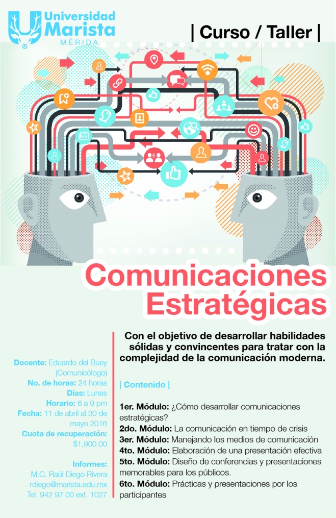En un escenario así, siempre hay que estar preparado. Para lo bueno y para lo peor. Y contar con las herramientas adecuadas para hacer frente a las tormentas. Con este objetivo, la Universidad Marista de Mérida ofrece el taller «Comunicación estratégica». Todos los lunes, a partir del 11 de abril y hasta el 30 de mayo, de seis de la tarde a nueve de la noche, en la Universidad Marista de Mérida. Este curso, con un precio de 1,900 pesos, incluye seis módulos, entre los que se encuentran:¿Cómo desarrollar comunicaciones estratégicas?, La comunicación en tiempo de crisis, Manejando los medios de comunicación, Elaboración de una presentación efectiva y Diseño de conferencias y presentaciones memorables para los públicos.