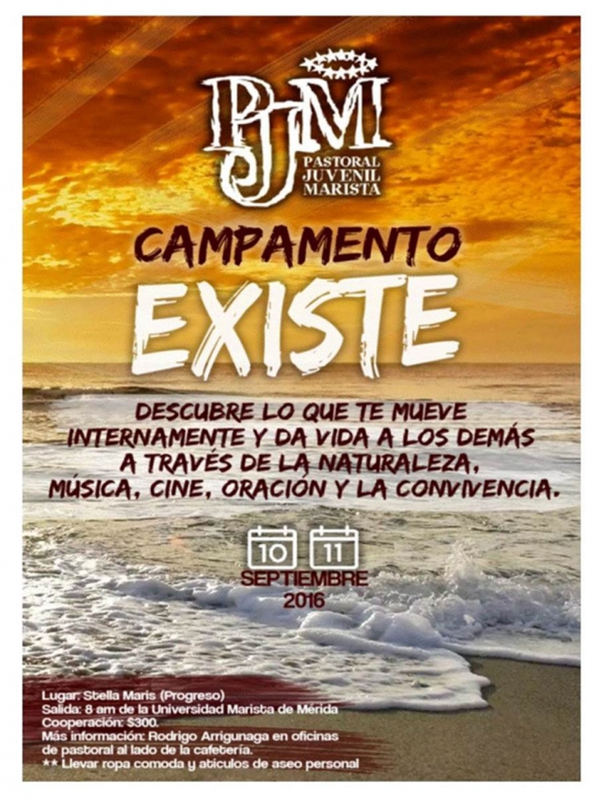 Este encuentro se realizará en el centro Stella Maris, en Progreso, y su objetivo es compartir experiencias en contacto con la naturaleza. La metodología de este encuentro será «dinámica, participativa, simbólica y diferente, atractiva a los jóvenes actuales», señala Ricardo Rodrigo de Arrigunaga Coello, coordinador de Pastoral. Sus oficinas se encuentran junto a la cafetería. Su teléfono es el 942 9700 ext. 1112, y su correo rarrigunaga@marista.edu.mx. Los interesados pueden acudir con él para mayores informes. El campamento Existe será impartido por jóvenes, «ex alumnos maristas de reciente egreso, para compartir la fe y esperanza», señala.