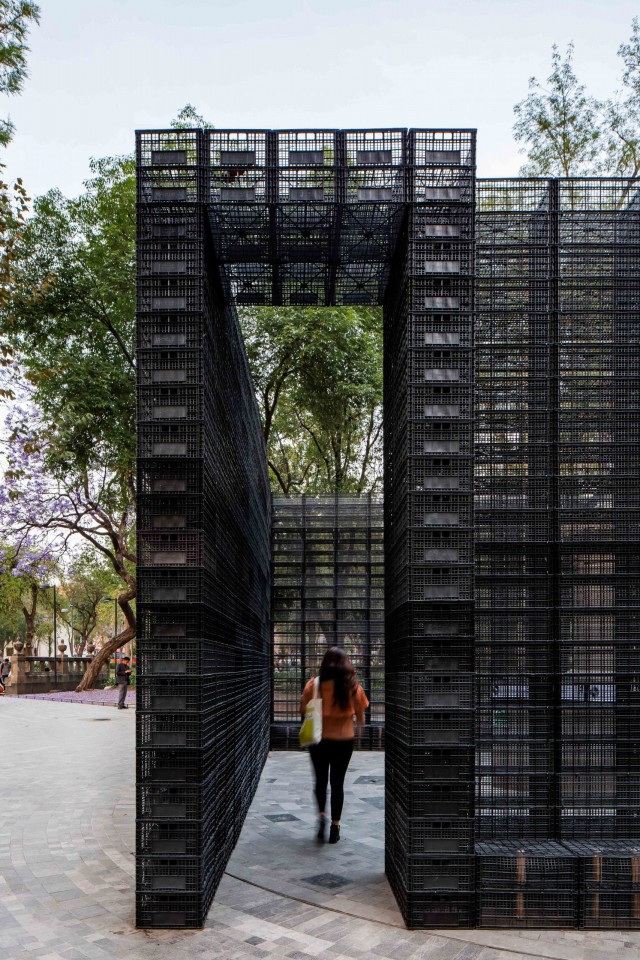 Como parte del ejercicio, los estudiantes debían hacerse cargo de la logística de montaje y desmontaje en sitio, siendo un reto enorme proyectar una estructura a distancia, no generar residuos y considerar el destino final después del evento. Se erigió en dos días un gran paralelepípedo de más de ocho metros de lado por seis metros de alto, compuesto por un patrón de contenedores agrícolas de color negro, con dos accesos y un par de grandes ventanales, que desde fuera permitían ver la escultura de la ninfa. En total, más de 1,400 cajas construyeron un gran envoltorio que filtraba la luz y regalaron a los usuarios una banca perimetral interior y otra en el exterior. Al desensamblarlo en el último día, los alumnos pusieron en venta las cajas de plástico a los visitantes interesados, finalizando en menos de 3 horas.