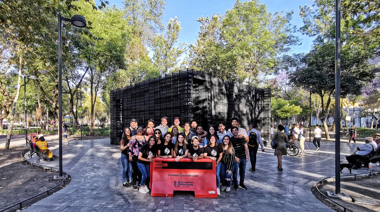 El pabellón de la Universidad Marista de Mérida fue diseñado en el aula universitaria y construido por los alumnos y profesores participantes del “Taller de proyecto urbano-arquitectónico” durante el período Enero - Marzo 2019. La propuesta se nombró “KIOSCO CONTENEDOR”, ubicándose alrededor de una de las fuentes de ninfas dentro de la concurrida plaza. El diseño tuvo como objetivo relacionarse con el sitio mediante dos actividades principales. La primera, introvertida y activa, pensada para una interacción con la fuente y la segunda, extrovertida y contemplativa, que buscaba una conexión con el entorno urbano.