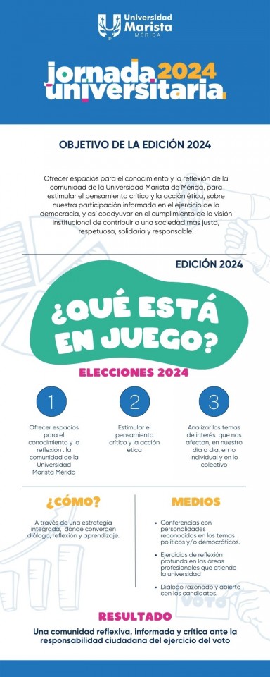 Crear un espacio para la reflexión y estimular el pensamiento crítico es el objetivo de la Jornada Universitaria “¿Qué está en juego? Elecciones 2024”, que la Universidad Marista de Mérida llevará al cabo del 16 al 18 de abril próximos.