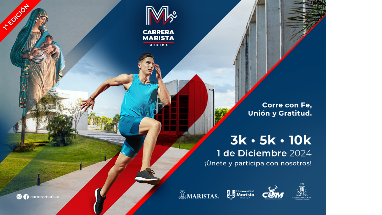 El domingo 1 de diciembre, desde las 6 de la mañana, se realizará la Carrera Marista “Corre con fe, unión y gratitud”, esperando un aforo de 1,500 personas entre integrantes y familias de la Comunidad Marista de Mérida y público en general, en categorías para todas las edades y distancias de 10, 5 y 3 kilómetros, y carreras infantiles.