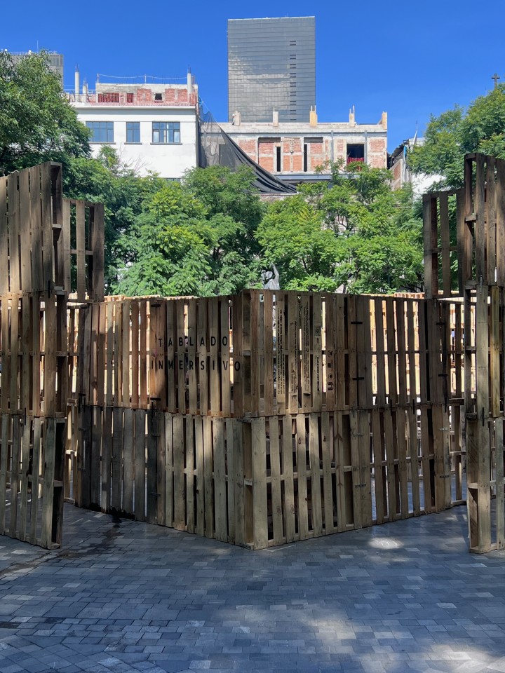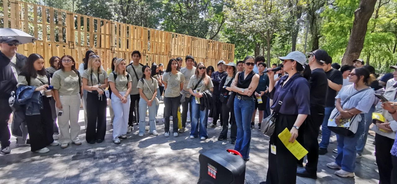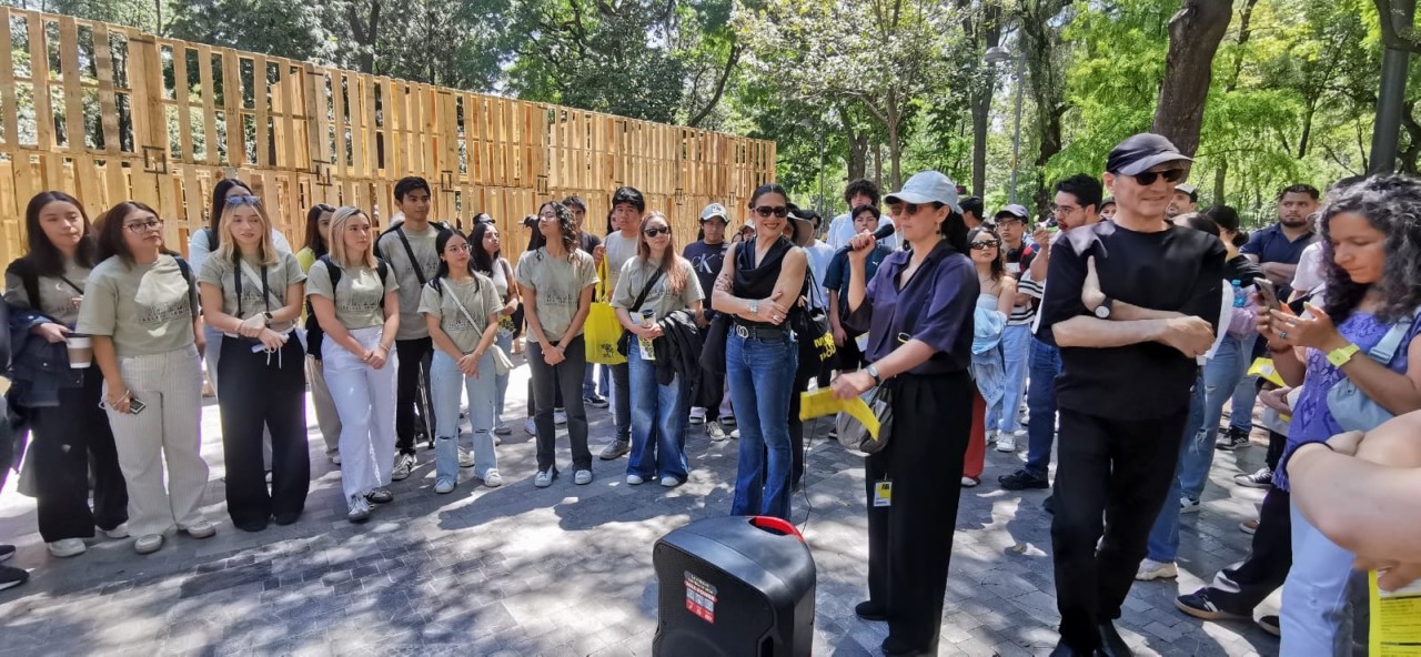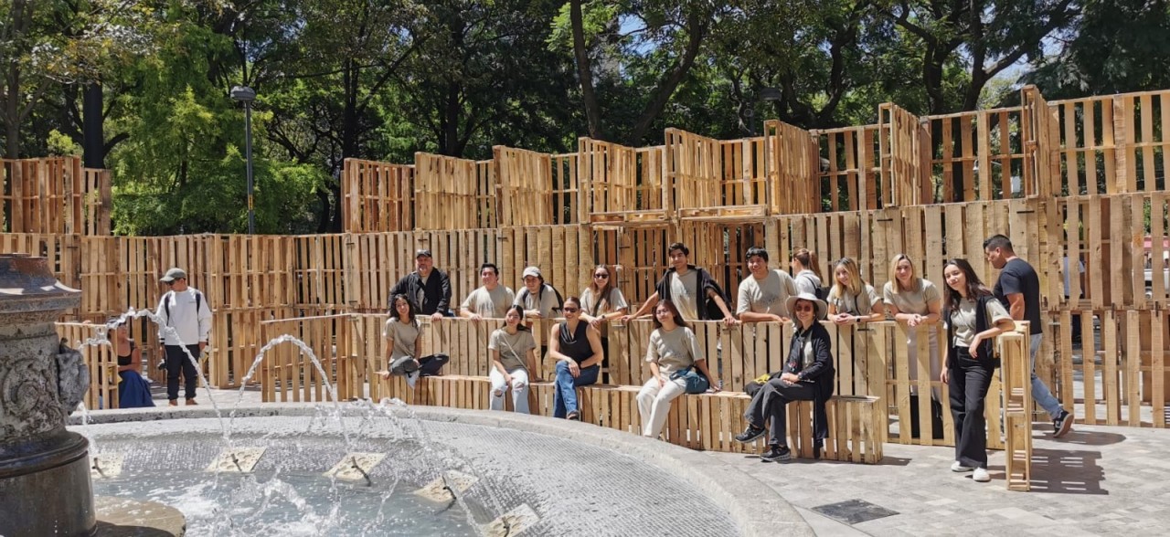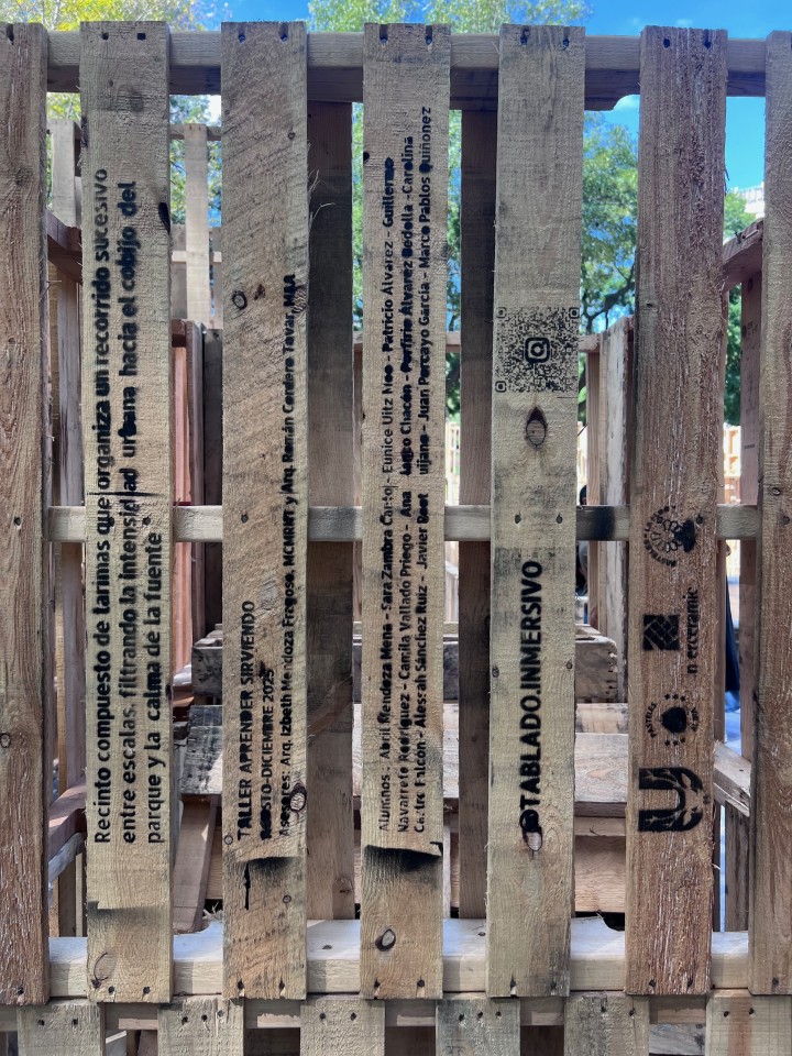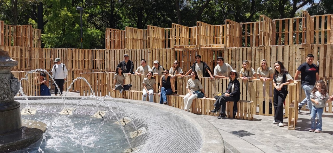 Como parte de la programación del festival, nuestros estudiantes presentaron el proyecto Tablado Inmersivo, un pabellón efímero diseñado especialmente para la Alameda Central, alrededor de la emblemática fuente de Mercurio. La propuesta traduce, mediante tarimas y muros de distintas alturas, un recorrido que lleva al visitante de la escala urbana al cobijo del parque, y de ahí a la intimidad del agua.