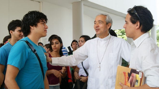 Recepcionado por el Rector Miguel Baquedano y por el Hno. Don Pablo Hernández, dijo sentirse en casa y muy contento de poder regresar y encontrarse con los alumnos y los amigos universitarios. En su homilía  dijo que las enseñanzas de la Universidad deben de trascender el terreno de las utopías para llevarlas a la acción de la vida diaria, como la forma de generar cambios en la sociedad, sin pensar en que son cosas inalcanzables, los principios de Iglesia Católica son principios universales y enfocados al bien común y en ellos se basan las enseñanzas de la U. Marista.