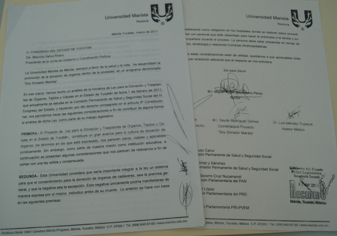 En ese marco, hemos hecho un análisis de la Iniciativa de Ley para la Donación y Trasplantes de Órganos, Tejidos y Células en el Estado de Yucatán de fecha 7 de febrero de 2011, que actualmente se estudia en la Comisión Permanente de Salud y Seguridad Social del H. Congreso del Estado; y haciendo uso del derecho consagrado en el artículo 8º Constitucional, nos permitimos hacer las siguientes consideraciones a fin de contribuir de alguna forma al análisis de dicha Ley, como parte de su trabajo legislativo.