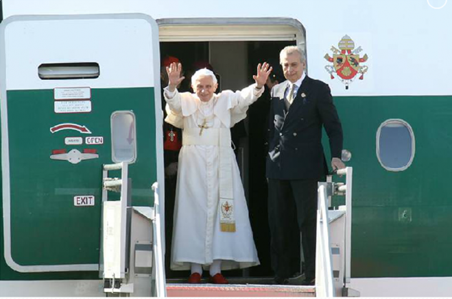 El mandatario dijo también a Benedicto XVI que lo recibe un pueblo que ha sufrido mucho, pero que hace esfuerzos para llevar alimento a las mesas de sus casas y sacar adelante a las familias.