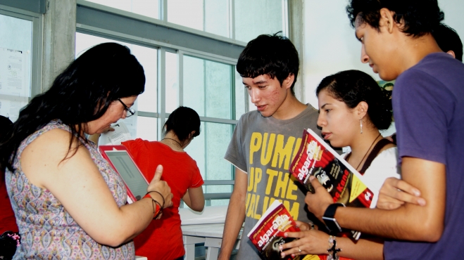 En amena charla de más de dos horas, la ponente abarcó diversos tópicos que rodean su desempeño como directora de arte. Desde sus pintores favoritos, tipógrafos que admira, la importancia de los signos y de la lectura en el profesionista del diseño, las cualidades que debe tener todo diseñador, la elección de la tipografía correcta, sus experiencias profesionales hasta sobre lo imprescindible que es una investigación de mercado para la toma de decisiones en una empresa editorial como Algarabía.